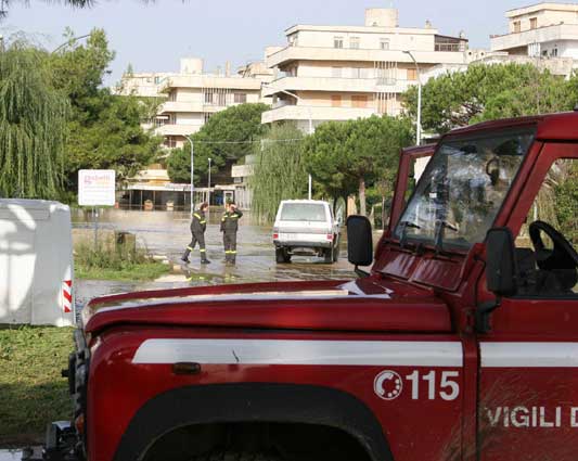 Alluvione- Il presidente Marrazzo ieri sera a Tarquinia sui luoghi più colpiti dal nubifragio- I vigili del fuoco hanno salvato madre e figlia intrappolate nella loro auto e un ragazzo disabile Straripa il Marta, una decina di famiglie evacuate Viterbo 16 novembre 2005 - ore 2,50