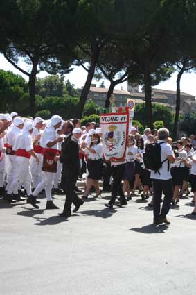 Si parte per il giro delle sette chiese. Al ritmo della banda di Vejano e dell’immancabile inno, inizia il corteo per le vie della città, salutato dai tanti viterbesi che ormai da diverse ore hanno già preso posto per assistere al trasporto.