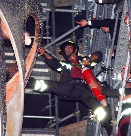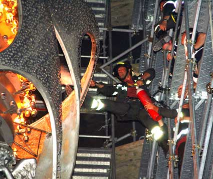 Dalla cera delle fiaccole, complice il vento, parte un principio d’incendio, che fortunatamente non intacca Ali di Luce, ricoperta di vernice ignifuga. Troppo alti, pare, alcuni stoppini, di conseguenza le fiamme arriva agli ordini superiori. Passano alcuni minuti interminabili, si prova con gli estintori, ma è l’arrivo di un mezzo dei pompieri, a riportare la situazione sotto controllo.