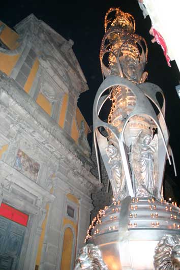 Poi verso Piazza Verdi. Lungo il Corso, Ali di Luce passa a pochi centimetri dai muri, ma con una precisione ed una leggerezza incredibili. Alle finestre chi saluta, chi tenta d’arrivare alla Macchina con una mano, lungo le strade, le piazze, tantissima gente. Anche sul percorso.